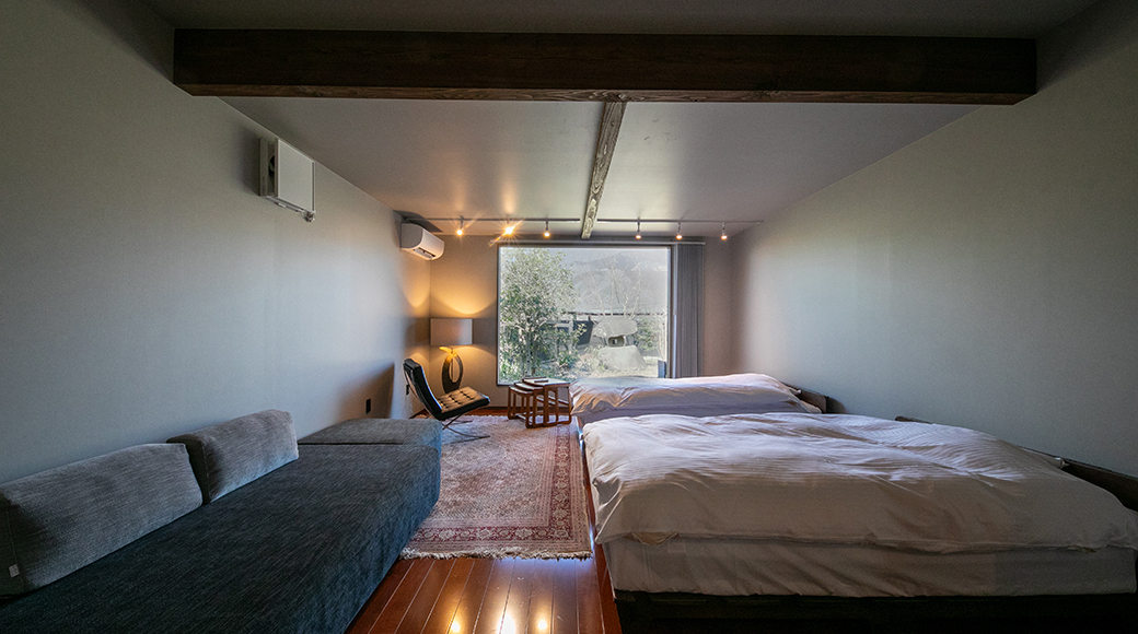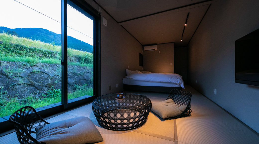 다다미 바닥에 로우 베드를 설치하여 여유로운 방 배치.