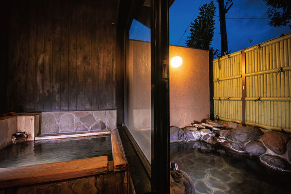 40평방미터의 차분한 공간에 개방적인 노천탕과 쾌적한 내탕을 완비.